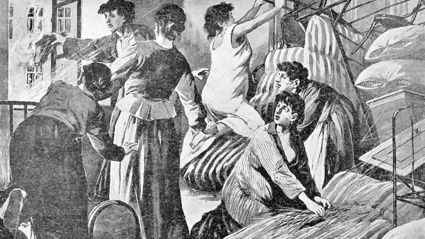"І що трафилося? Шпитальна адміністрація намислила спровадити шістьох кобіт, яких лікували від паскудної хороби, на покарання до поліції. Але ті й гадки не мали так легко піддатися сему капосному наміру. Коли посадовці прийшли до жінок, то запевнилися, що двері палати зсередини заперті на ключ. У тому часі кобіти вже встигли вибехкати від підлоги до самої стелі барикади з ліжок, крісел, нічних тумбочок, сінників і т. п. Водночас вони зчинили такий пекельний писк і галас, що підняли на ноги не тілько весь шпиталь, але й всю округу. А попри се взялися кидати з вікон на подвір’я палаючу солому з матраців", – писали у часописі.