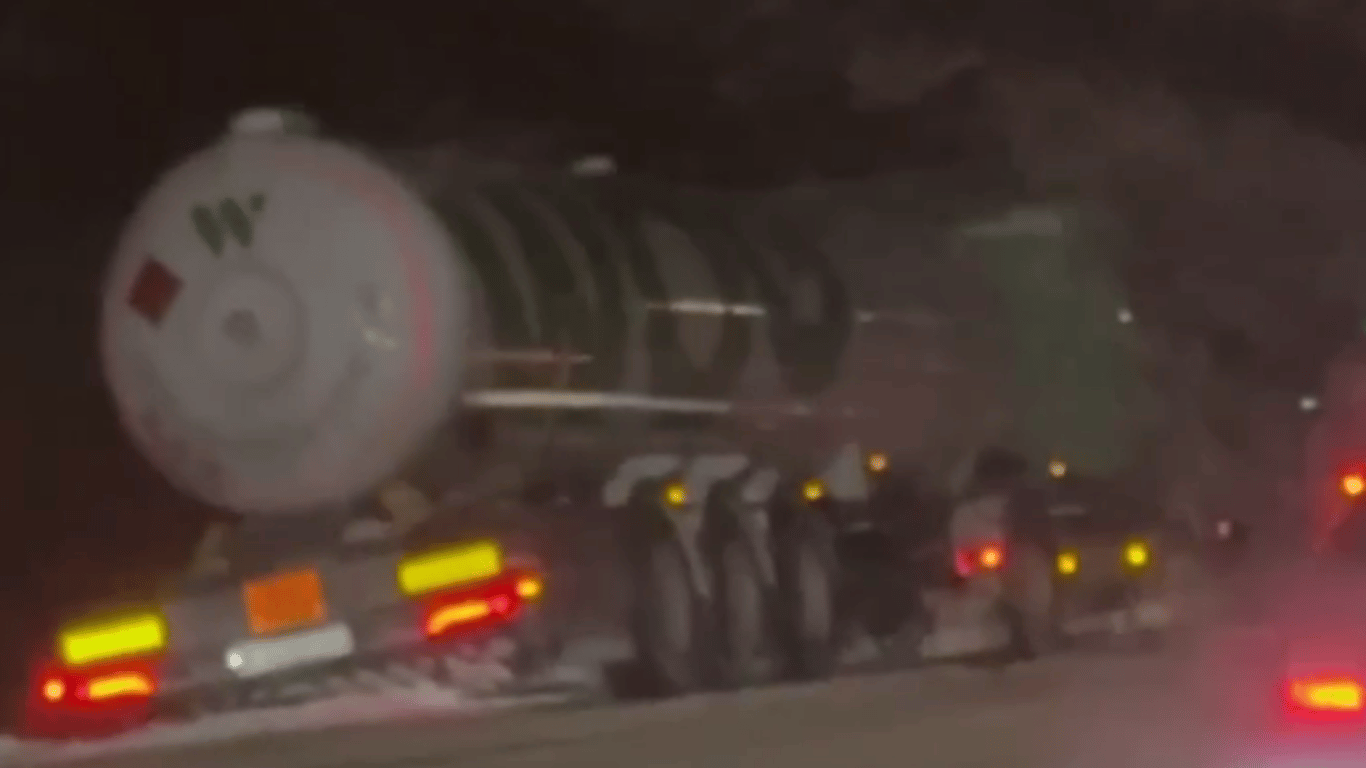 На відео видно, як бензовоз стоїть на узбіччі дороги й не може виїхати. На місце вже прибули спеціальні служби.
