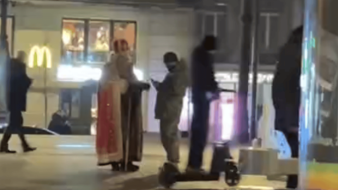 На кадрах, снятых очевидцами, видно, как мужчину, одетого в традиционную красную шубу, митру и с посохом, окружили работники ТЦК.