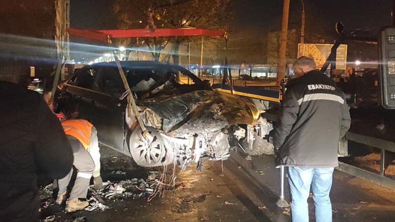 Во Львове пьяный водитель снес светофор и протаранил ограждение: авто загорелось. Фото