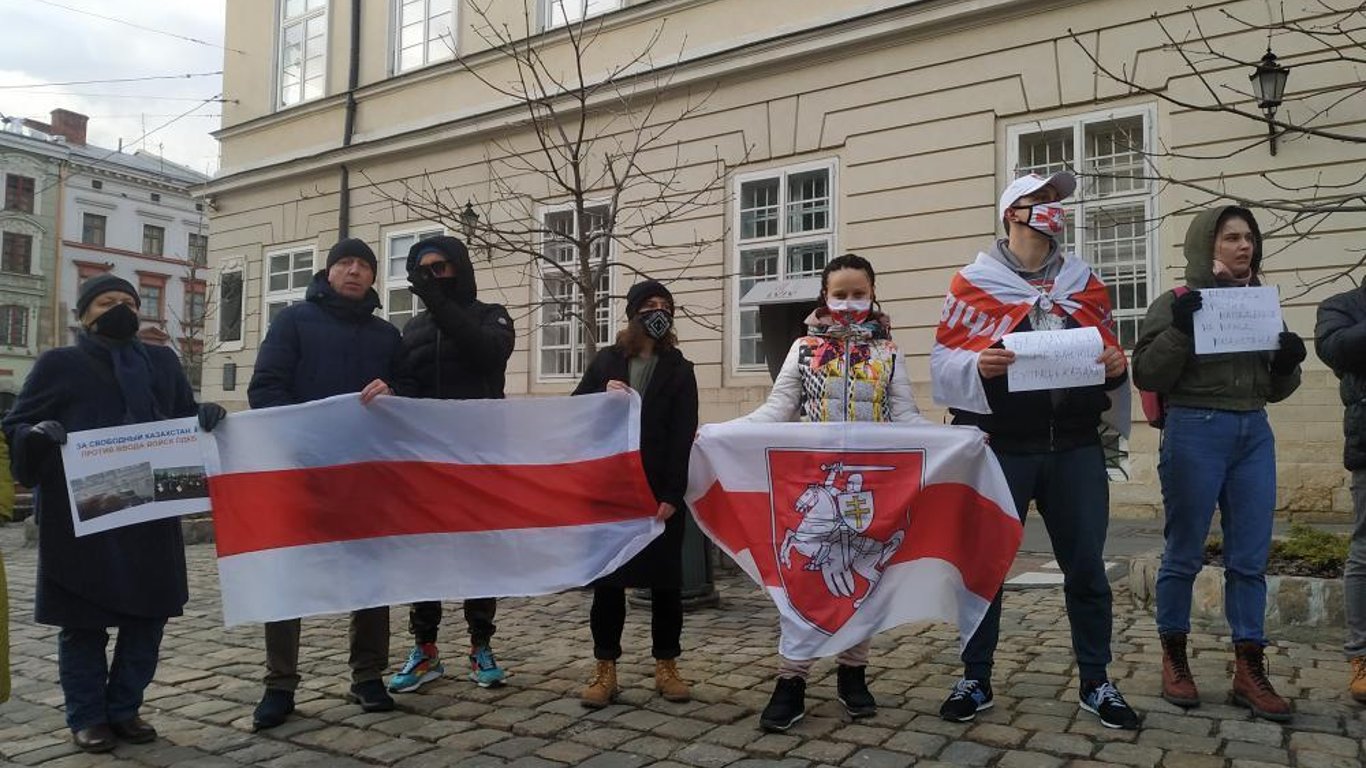 Во Львове прошла акция в поддержку народа Казахстана. К шествию присоединились белорусы и белоруски, которые вышли на акцию с плакатами.