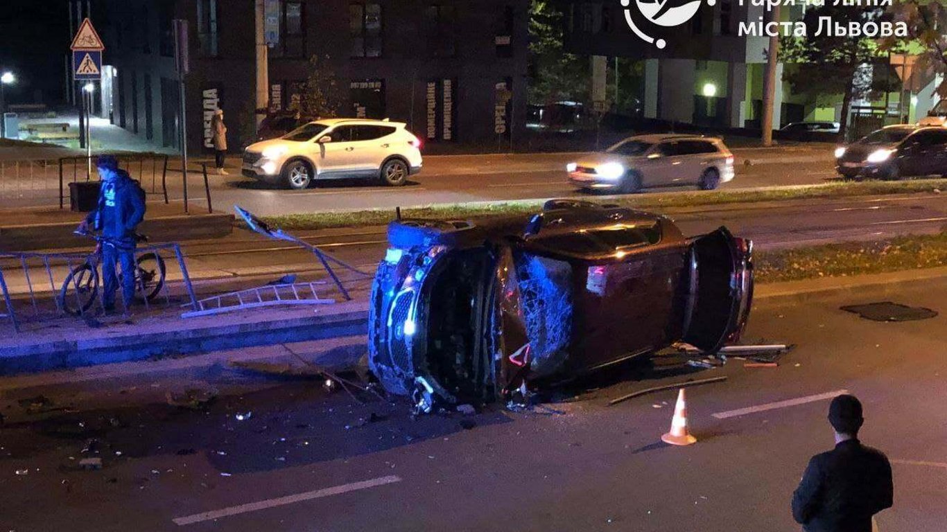 Во Львове водитель навеселе врезался в трамвайную остановку и перевернулся. Фото