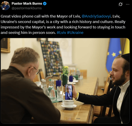 "Чудовий відео-телефонний зв'язок з мером Львова, Андрієм Садовим. Львів, друга столиця України, — місто з багатою історією та культурою", — написав Бернс.