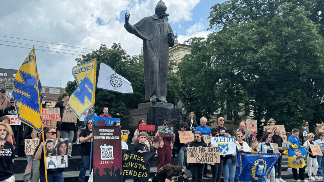 На акцію зібралося близько сотні людей — це рідні бійців, побратими, волонтери та небайдужі львів’яни. Вони тримали плакати з закликами звільнити полонених, фото військових, які вже багато місяців не виходять на зв’язок.